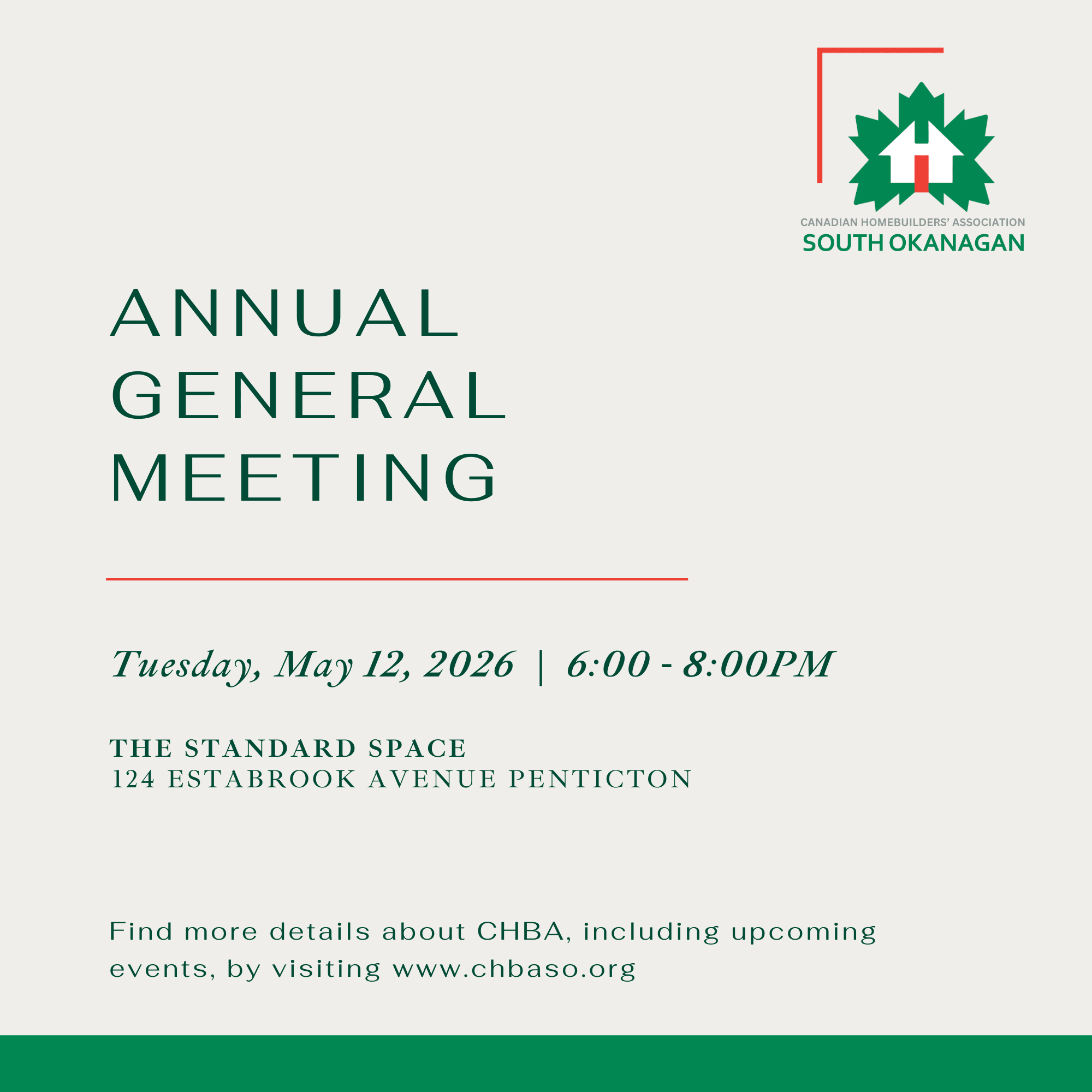 Please join us for the CHBA South Okanagan Annual General Meeting (AGM). This is an important opportunity for members to review the past year, hear organizational updates, and take part in key association business including elections (as applicable), financial reporting, and plans for the year ahead.